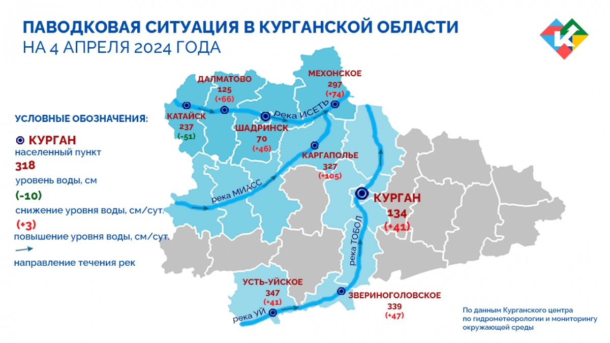 Курганский центр по гидрометеорологии и мониторингу окружающей среды фиксирует подъём уровня воды на крупнейших реках региона, за исключением уровня реки Исеть в районе Катайска, где зафиксировано снижение на 51 см. Наибольший рост за последние сутки произошёл в районе р.п. Каргаполье. В створе поста реки Исеть в с. Мехонское отмечается выход воды на пойму. На всех участках наблюдений продолжается разрушение ледяного покрова. Гидрометцентр прогнозирует, что интенсивный рост уровня воды сохранится в ближайшие 1-2 дня.