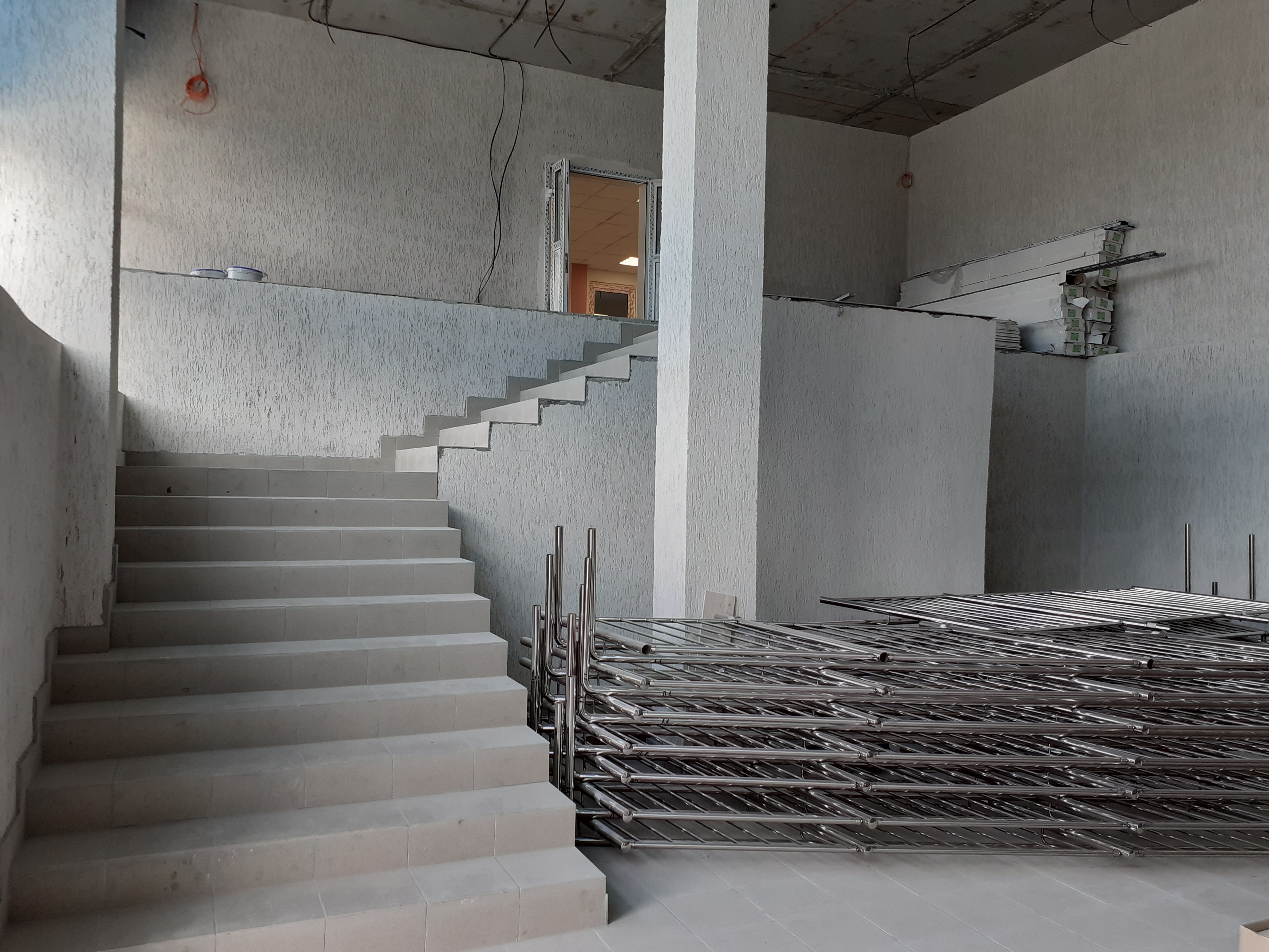 В здании идет покраска потолков и стен, производится монтаж подвесного потолка «Армстронг» и светодиодных светильников. Также проходит укладка напольной плитки и установка перил на лестничных маршах.