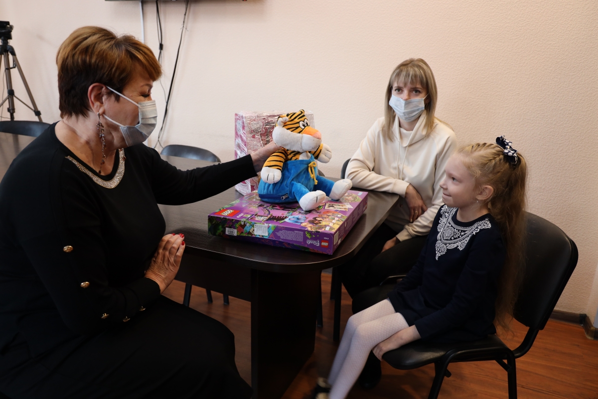 Елена Перминова вручила конструктор Лего, игрушечного тигренка и сладкий набор.